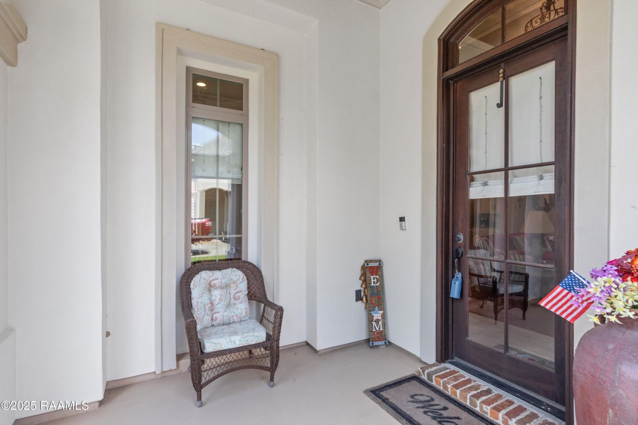 Overlooking the pond, this beautiful French-style home in the highly sought-after MonJardin subdivision features 3 bedrooms, 2 bathrooms, and a private office with its own patio entry, perfect for a home-based business. Nestled on a private lot with stunning views of the community gazebo, this home showcases arched entryways, 12-foot ceilings, triple-crown molding, 7-inch baseboards, a coffered kitchen ceiling, and a bright open living area with fireplace, built-ins, and abundant natural light. Lots of craftsmanship and details throughout! The kitchen includes a walk-in pantry, while the spacious primary suite offers an oversized jacuzzi tub, tiled walk-in shower, and large walk-in closet. Outdoor living shines featuring a tiled patio with remote electric shades, outdoor kitchen, open courtyard, and relaxing water views of the stocked pond and native birds. Additional features include Sonos Surround Sound in 3 zones, a whole-house generator, gutters, security system, garage storage, full backyard fence, and professional landscaping. House was painted inside and out 3 years ago. MonJardin is known for its wide streets, luxurious homes, swimming pool, stocked ponds, fountains, and community center, making this home the perfect blend of privacy, comfort, and elegance.