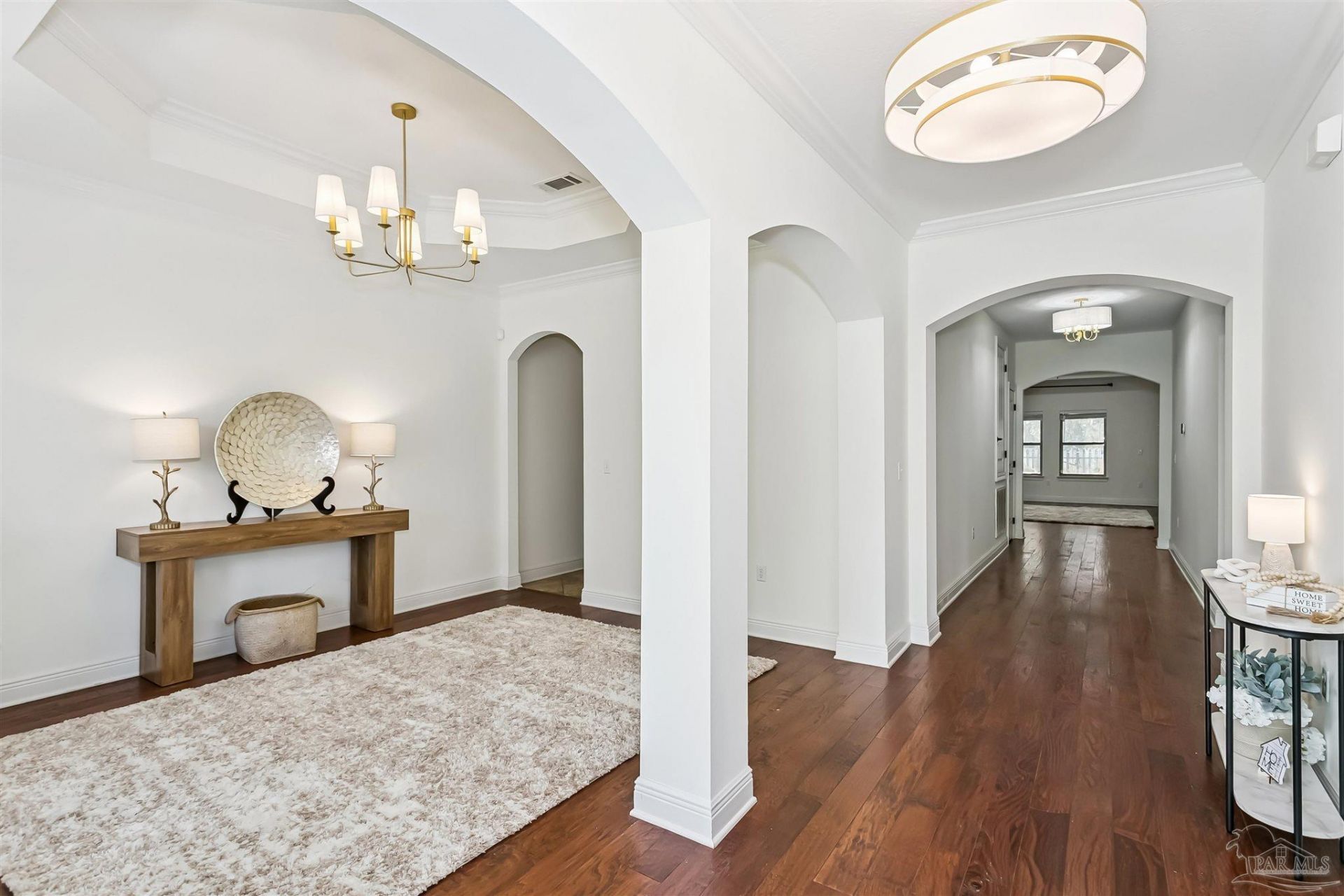 Beautiful premier one-story, POOL home that includes a brand NEW GOLF CART!! Located within the sought-after gated community of Nature Trail this exquisite property is positioned against a greenbelt for optimal backyard privacy and showcases superior craftsmanship throughout, including hand-scraped hardwood flooring, custom cabinetry, and granite surfaces. The spacious and well-planned layout is designed for both comfort and luxury, featuring a 3 way split floorplan that includes a gourmet kitchen with a gas range, a dedicated office, and a primary suite with elevated tray ceilings. For added peace of mind and versatility, the home is equipped with a newer whole-house generator and includes additional space suitable for an in-law suite. The interior transitions seamlessly to an impressive outdoor living area, which features a stunning swimming pool and hot tub surrounded by pavers. The backyard also offers a covered lanai, a fully equipped outdoor kitchen, and ample extra yard space for recreation. Residents of Nature Trail enjoy exceptional community amenities, including five miles of hiking trails, tennis and pickleball courts, a fitness center, and a community pool. The location is also highly convenient, situated just 2.5 miles from the interstate and less than 30 minutes from Pensacola's award-winning beaches and downtown area.